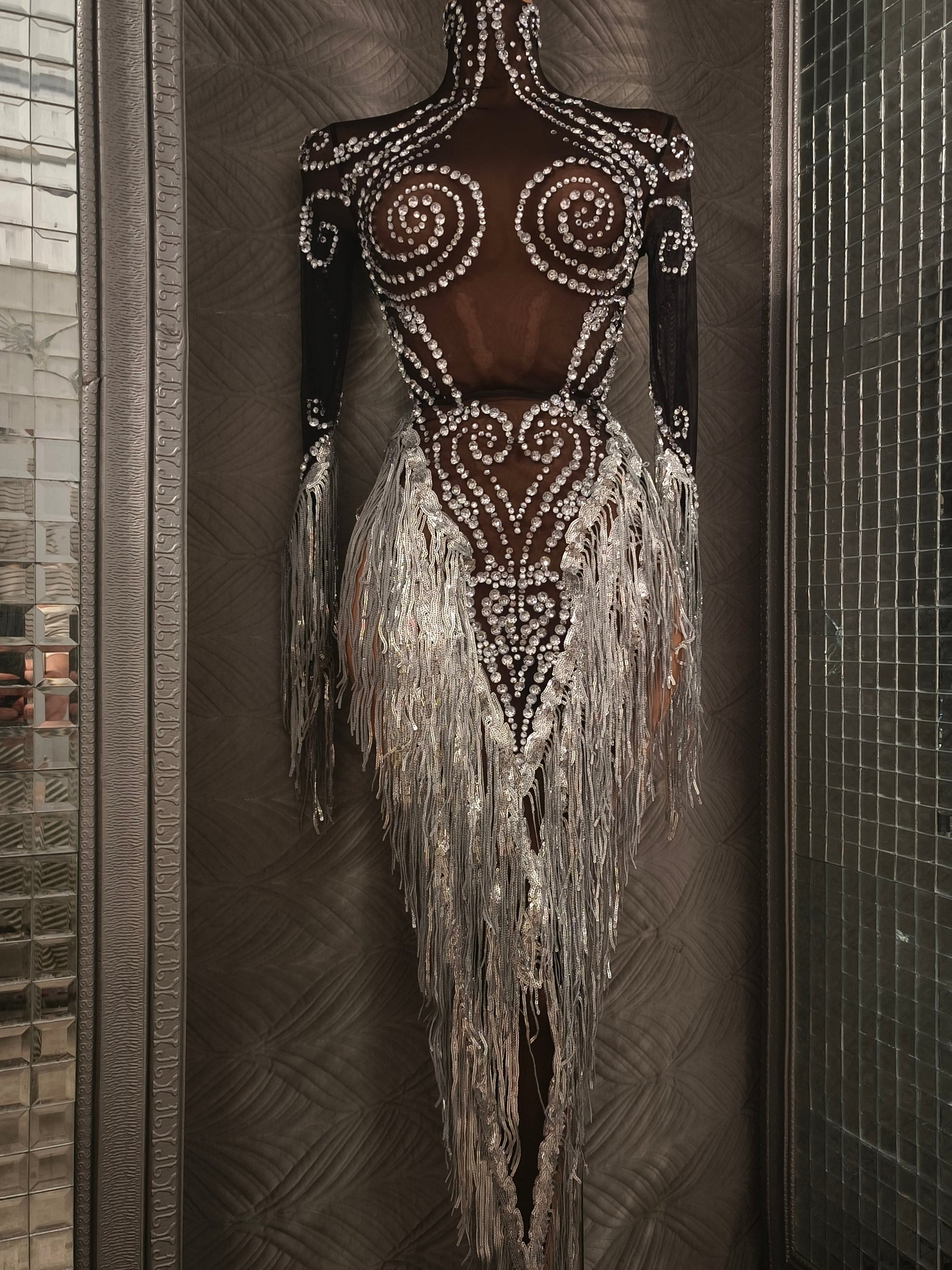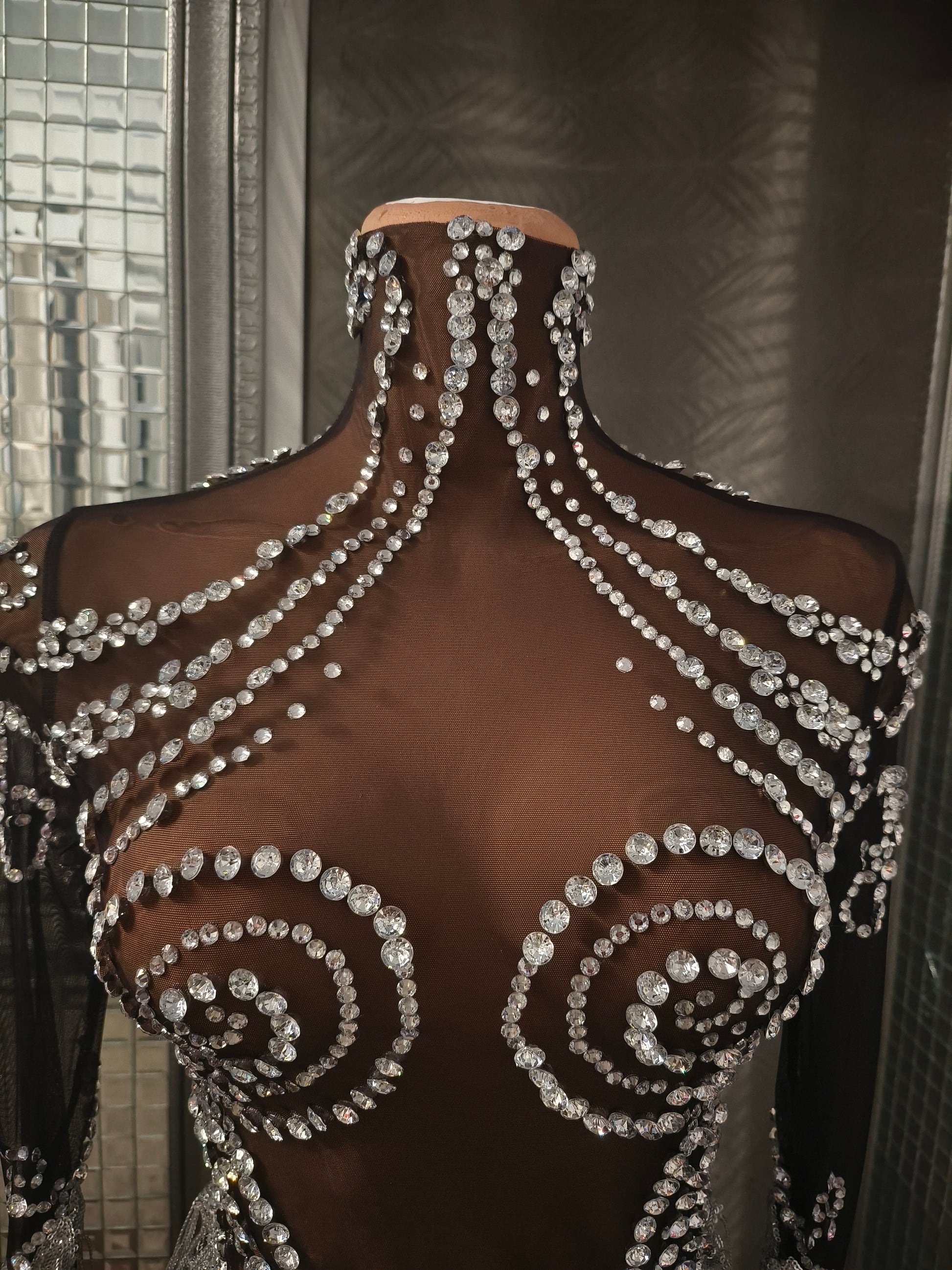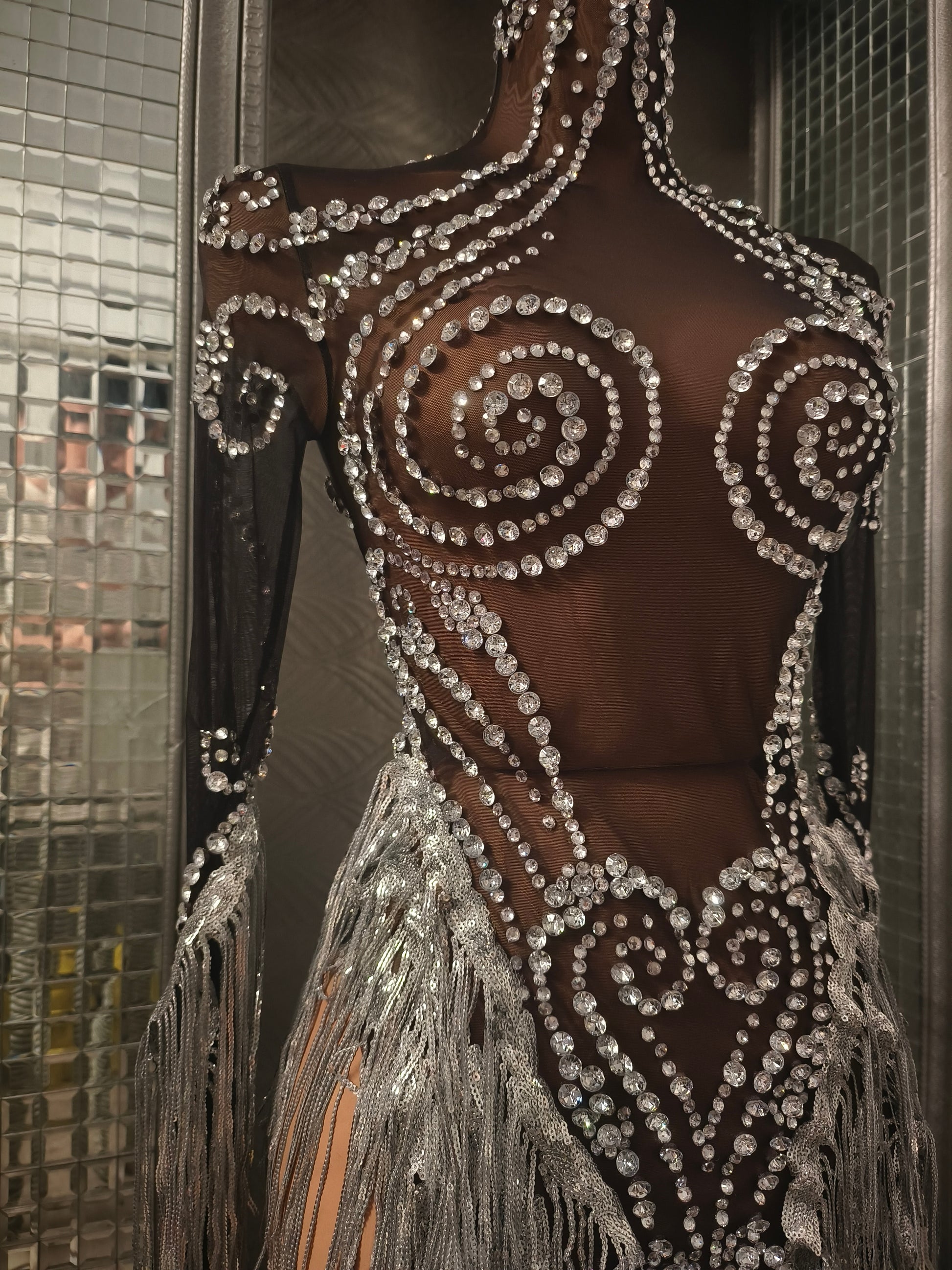 Step into the spotlight with the Shining Rhinestone Tassel Dress, a showstopping piece that combines the allure of sparkling crystals with the grace of flowing tassels. This dress is not just an accessory but a statement piece, designed to make you the center of attention at any event. Whether you're a singer, a dancer, or a showgirl, this dress is tailored to elevate your performance and make you stand out. The free size and elastic mesh construction ensure a comfortable fit for a wide range of body types, making it a versatile choice for various occasions.