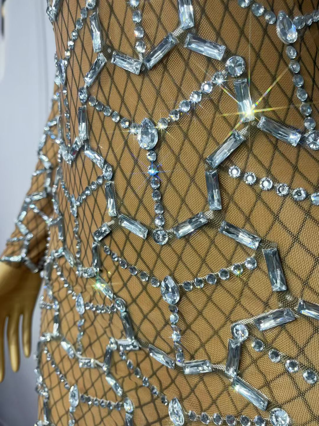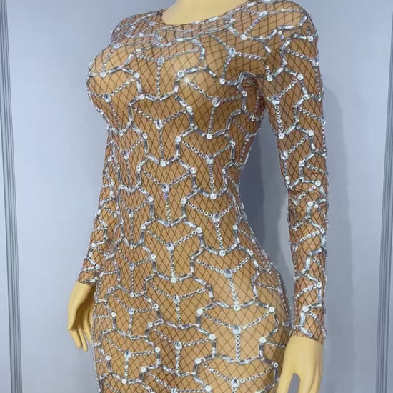 Heizhuwang Spiderweb Rhinestone Long-Sleeve Sheer Dress