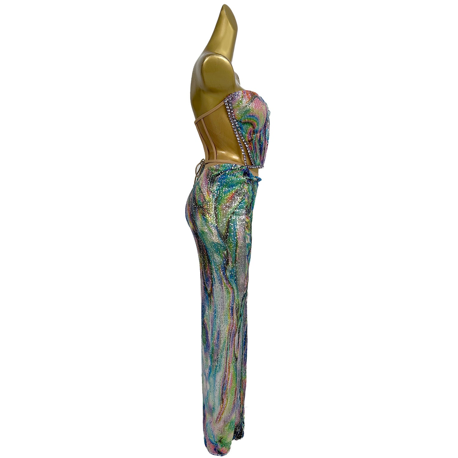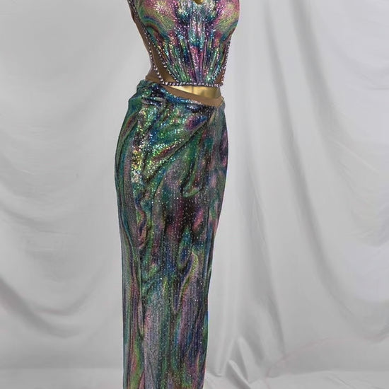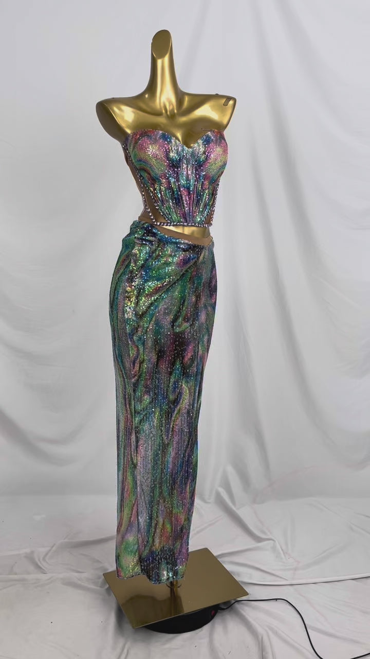 Huancai Women Sparkle Sequined Rhinestone 2-Piece Long Dress