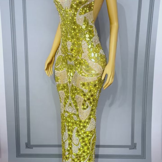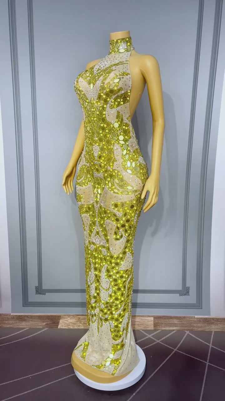 Jincaihua Golden Lens Rhinestone Flower Long Prom Dress