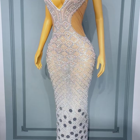Langchao Strapless Deep V-Neck Pearl and Rhinestone Mirror Long Dress
