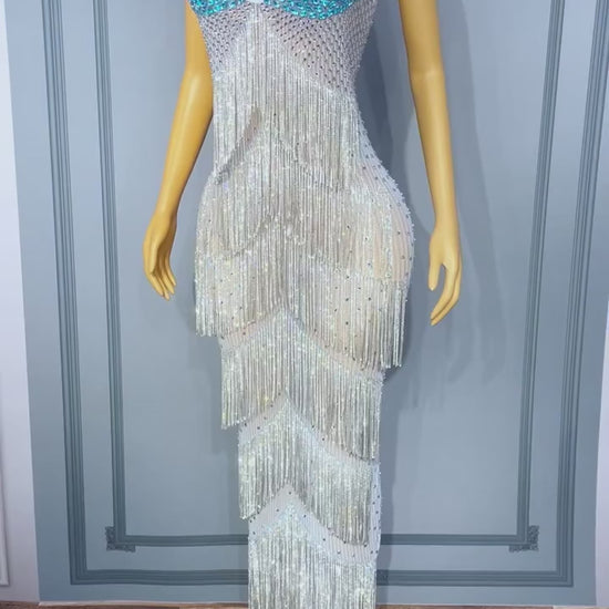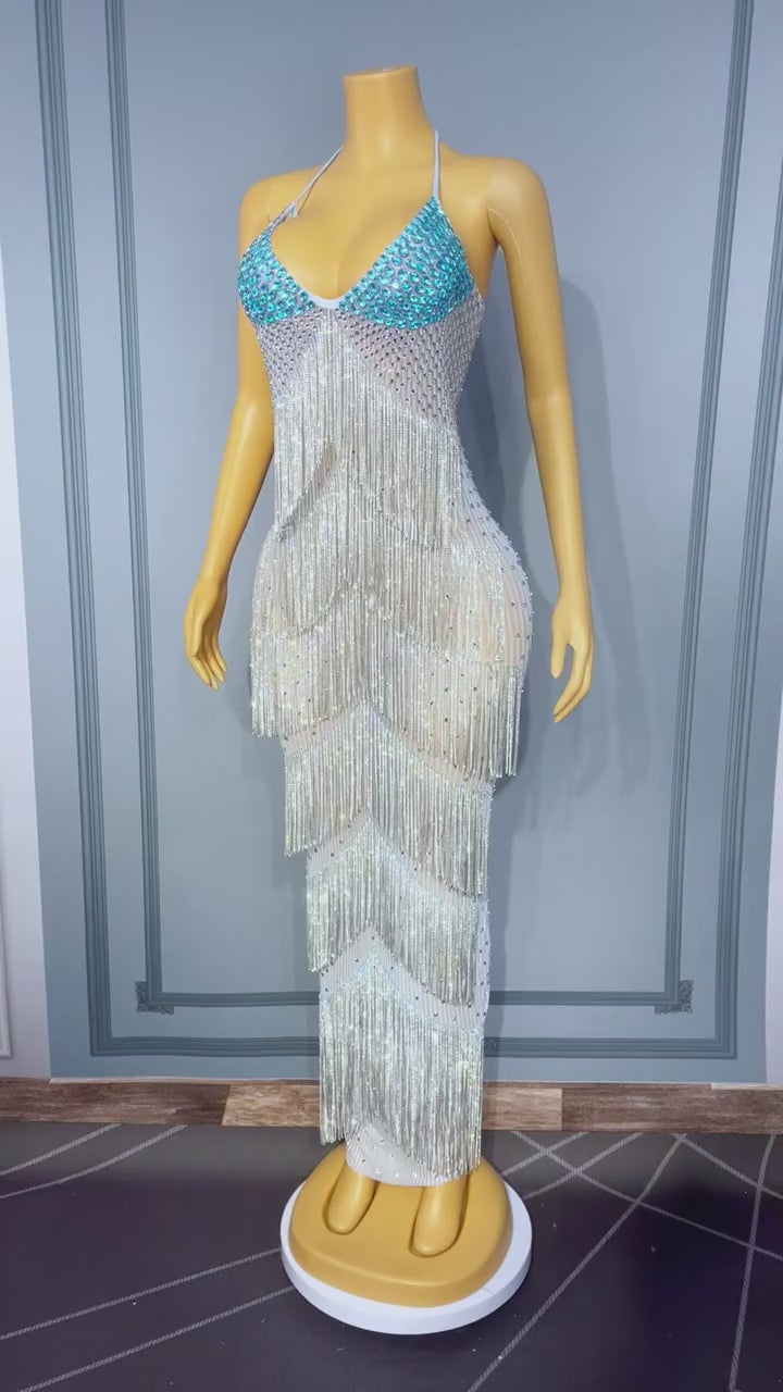 Step into the spotlight with the Shining Rhinestone Tassel Dress, a showstopping piece that combines the allure of sparkling crystals with the grace of flowing tassels. This dress is not just an accessory but a statement piece, designed to make you the center of attention at any event. Whether you're a singer, a dancer, or a showgirl, this dress is tailored to elevate your performance and make you stand out. The free size and elastic mesh construction ensure a comfortable fit for a wide range of body types, making it a versatile choice for various occasions.