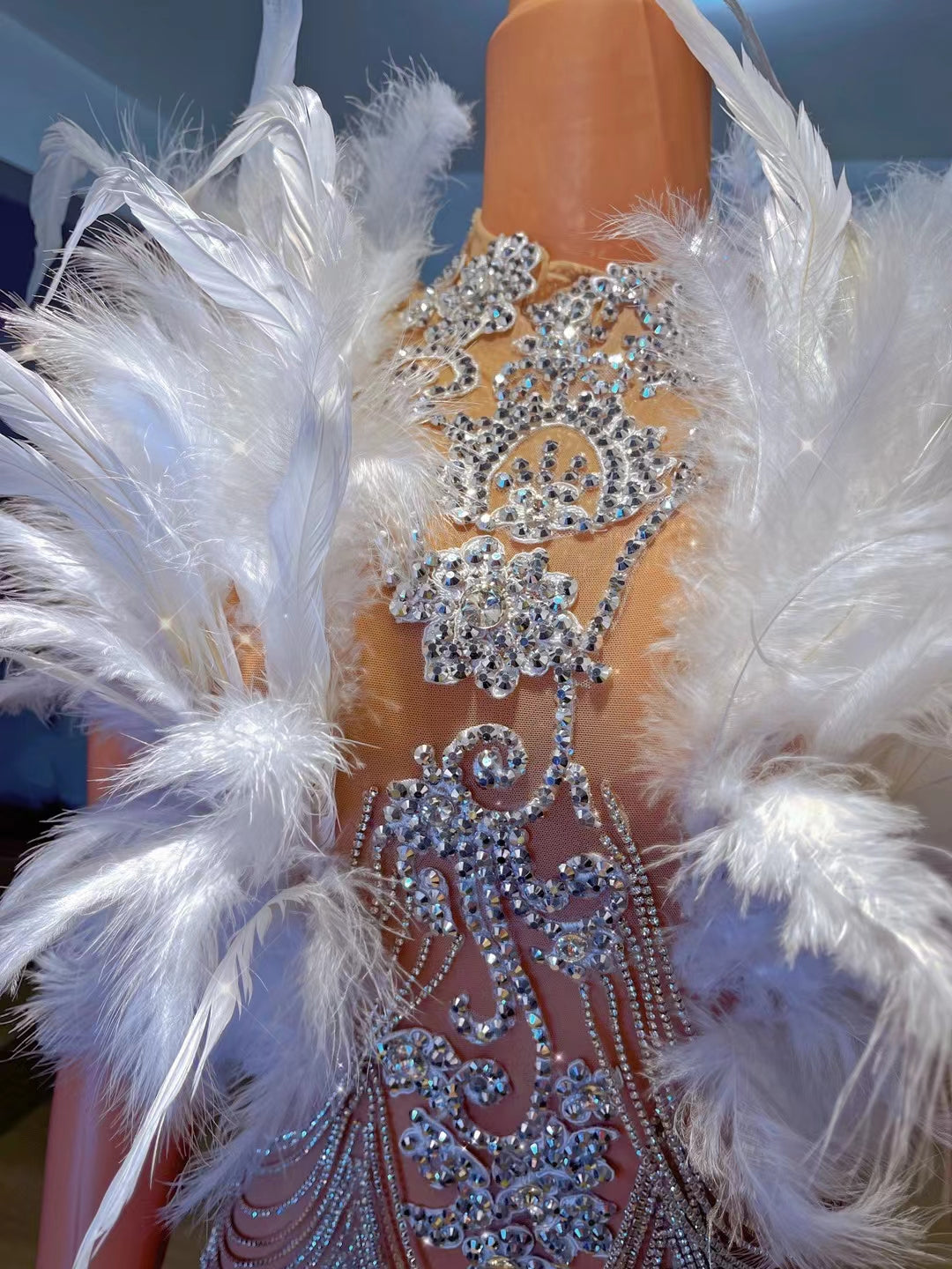 Majia White Feather Diamonds Chains Short Dress