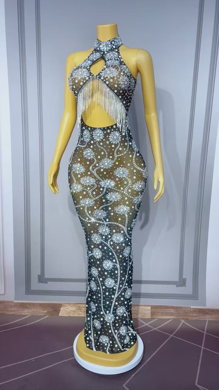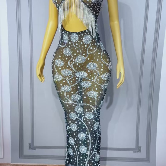 Step into the spotlight with the Shining Rhinestone Tassel Dress, a showstopping piece that combines the allure of sparkling crystals with the grace of flowing tassels. This dress is not just an accessory but a statement piece, designed to make you the center of attention at any event. Whether you're a singer, a dancer, or a showgirl, this dress is tailored to elevate your performance and make you stand out. The free size and elastic mesh construction ensure a comfortable fit for a wide range of body types, making it a versatile choice for various occasions.