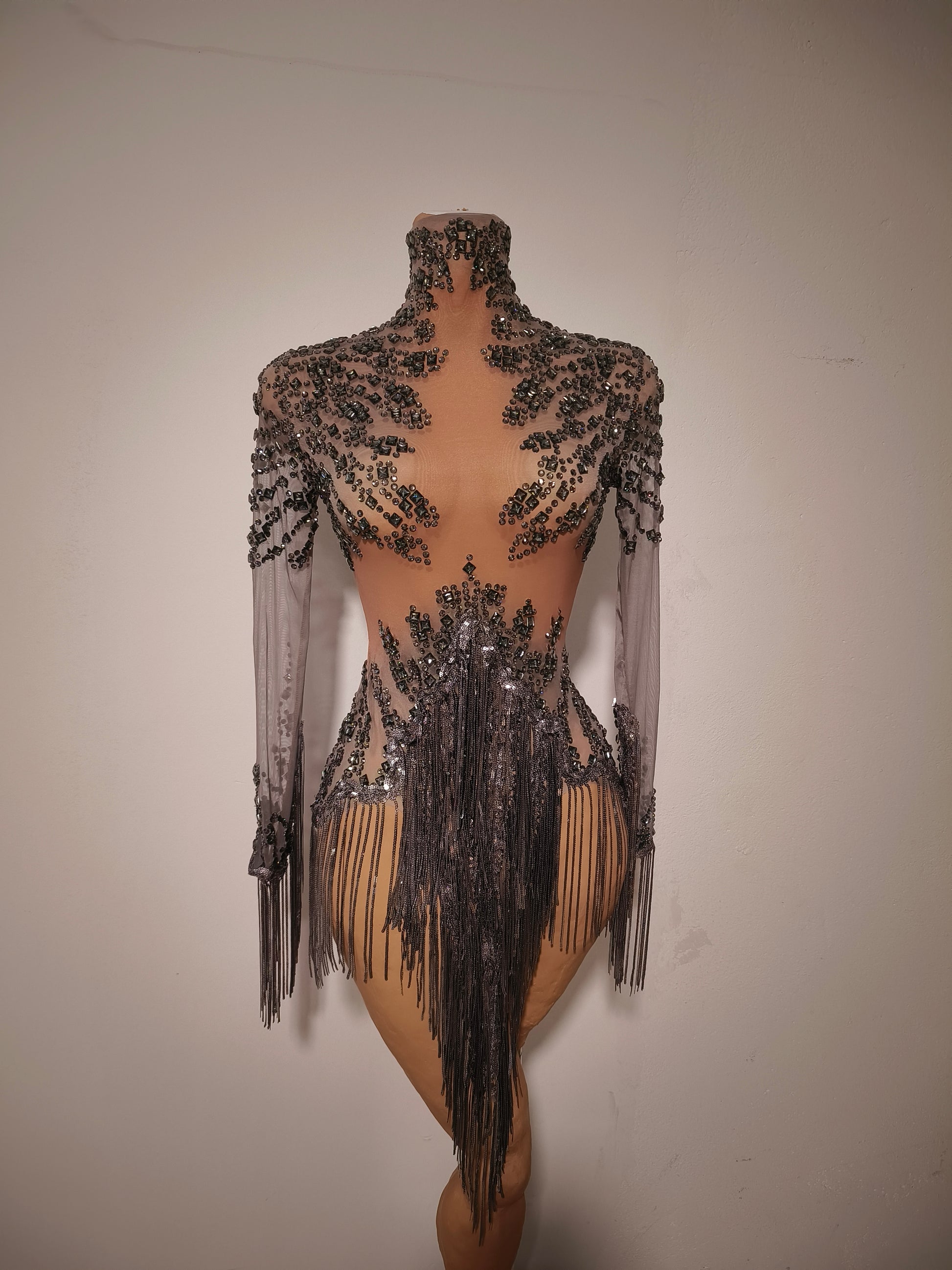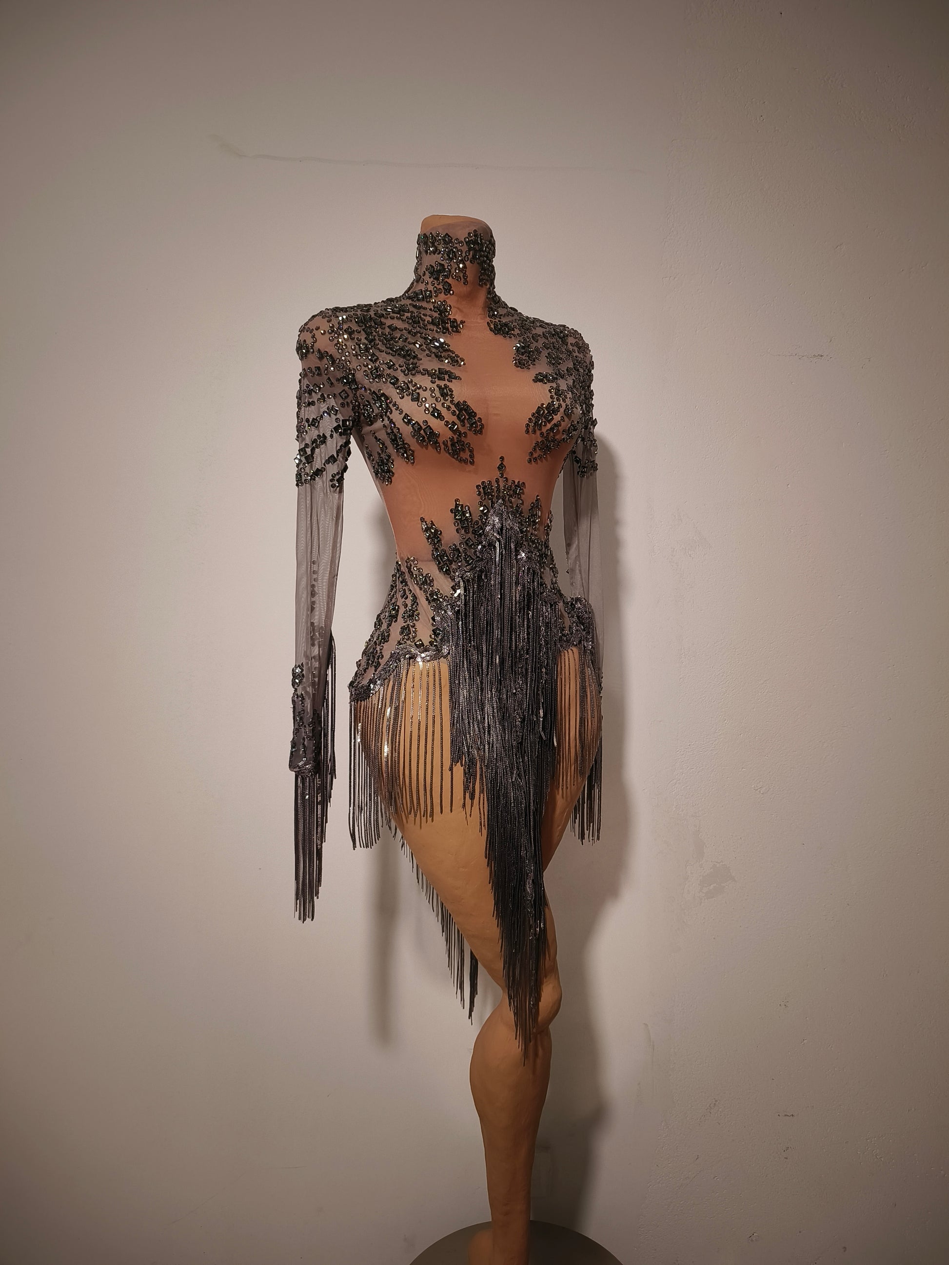 Step into the spotlight with the Shining Rhinestone Tassel Dress, a showstopping piece that combines the allure of sparkling crystals with the grace of flowing tassels. This dress is not just an accessory but a statement piece, designed to make you the center of attention at any event. Whether you're a singer, a dancer, or a showgirl, this dress is tailored to elevate your performance and make you stand out. The free size and elastic mesh construction ensure a comfortable fit for a wide range of body types, making it a versatile choice for various occasions.