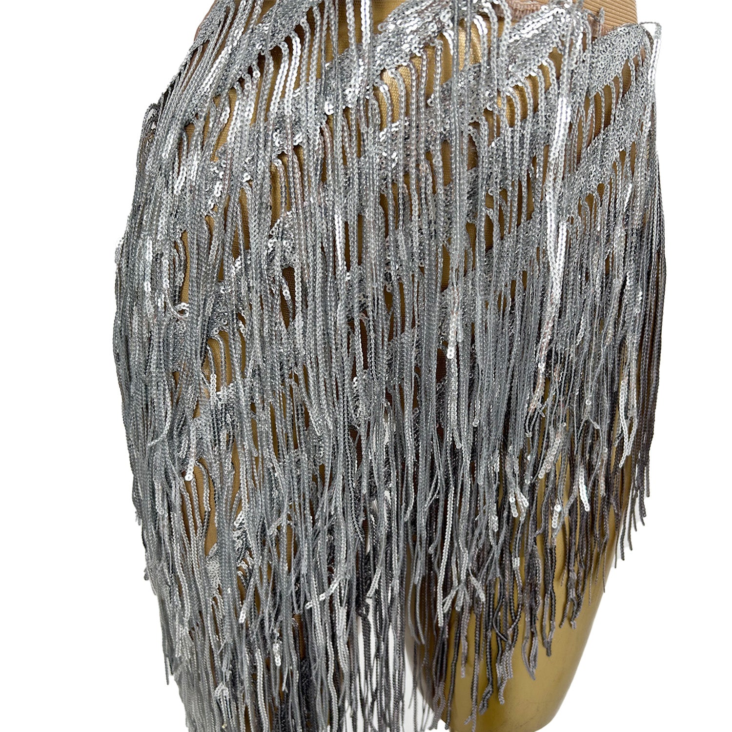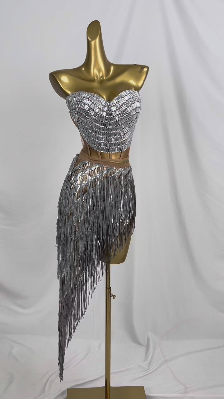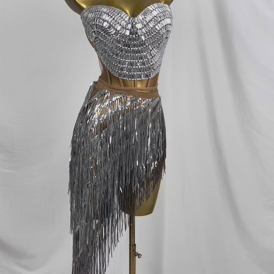 Weijing Silver Sequins Tassel Mini Skirt Crop Tops 2 Pieces Set