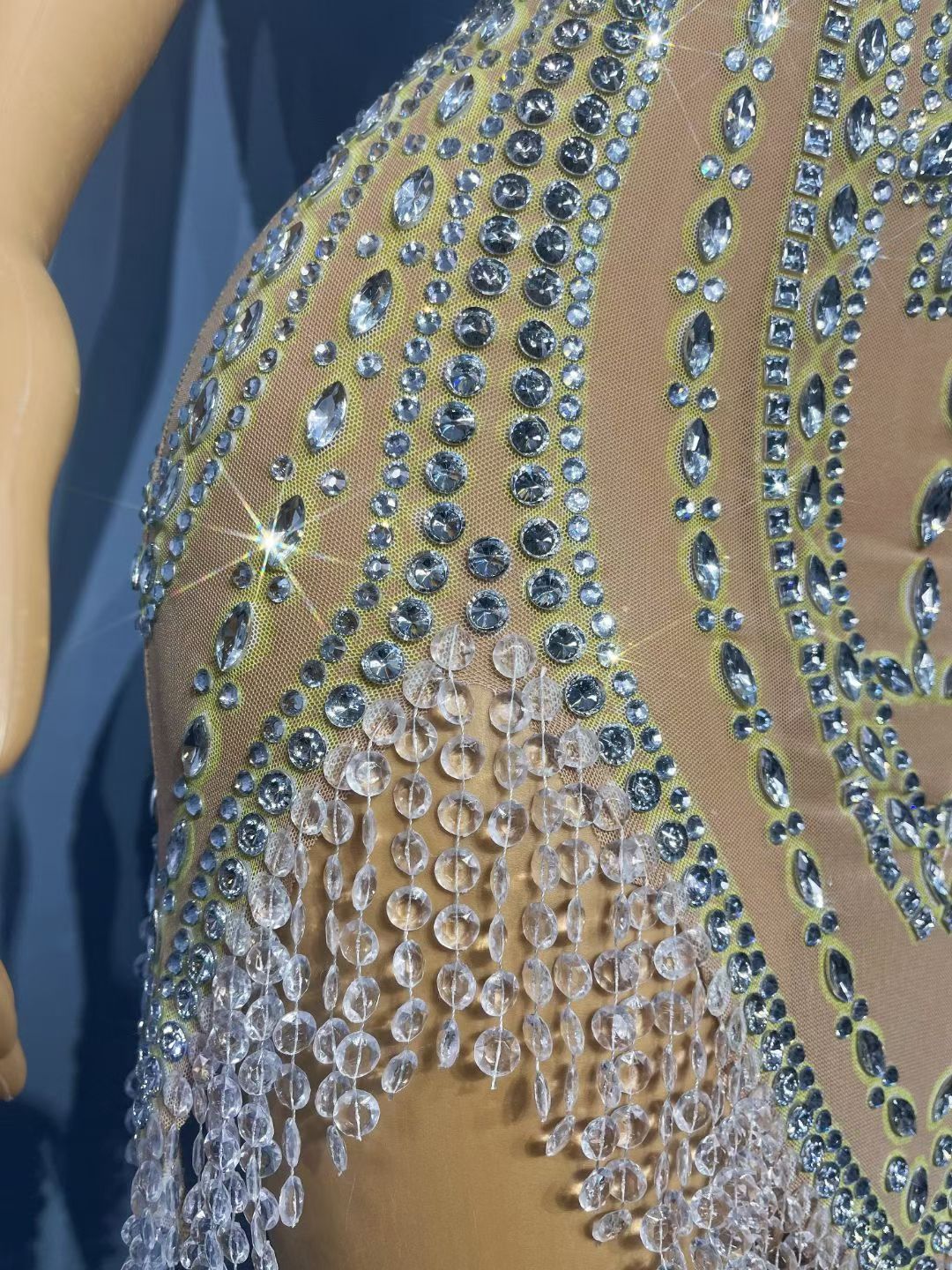 Step into the spotlight with the Shining Rhinestone Tassel Dress, a showstopping piece that combines the allure of sparkling crystals with the grace of flowing tassels. This dress is not just an accessory but a statement piece, designed to make you the center of attention at any event. Whether you're a singer, a dancer, or a showgirl, this dress is tailored to elevate your performance and make you stand out. The free size and elastic mesh construction ensure a comfortable fit for a wide range of body types, making it a versatile choice for various occasions.